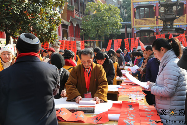 中午时分,宝通禅寺常佑法师、灵皓法师加入到写春联的队伍中,慈悲助力请“福”回家,现场气氛达到高潮。信众们纷纷前来请春联,两位法师皆欣然应允,并各自一连写了好几十幅。直到下午四点,十余位信众向常佑法师请春联的信众,仍不肯“放”他离开。