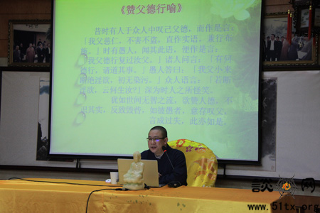 《赞父德行喻》讲的是一人想赞叹其父,但是却夸大其词,结果弄巧成拙,被人嘲笑。在为信众解析了经文后,法晗法师教诲在场信众:赞叹别人的德行要以事实为依据,恰如其分。言过其实的赞叹反而是愚痴的行为,还可能适得其反,使被赞叹之人遭到诋毁和诽谤。那么自己的德行如何才能配得上别人的赞叹呢?针对这个问题,法晗法师引经据典,以“锄园得金”、“管宁割席”两个典例为信众做了详细开示:所谓厚德才能载物,内在的德行远强于外在的包装,因此我们应当朴实谦逊,努力精进,不断提升自己内在的德行。