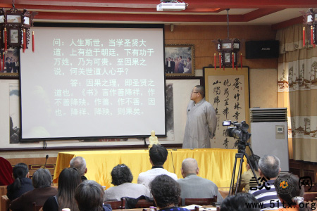 随后纯善法师引用《安士全书》文段,并对文段逐句讲解,同时将佛教“因果学说”贯穿于讲解中。纯善法师在开示中说到:“因果学说”是佛教的根本教义,对于改善世道人心意义重大,信因果便不敢造恶业,于世界可得太平盛世,于个人能改善净化人心。纯善法师还通过对所引用文段中“作善降祥,做不善降殃”、“吉凶消长”、“五福”、“六极”等词句的解析告诉在场信众,佛教“因果学说”与中国儒家观点中相一致的地方。