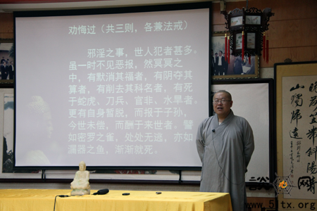 经文中讲到“离非梵行,而行施故,常富财宝,无能侵夺,其家贞顺,母及妻子,无有能以欲心视者。”纯善法师为大家解析到:离非梵行就是指远离不正当的男女关系,亦即远离邪淫之事。若能照此奉行,则家庭安顺无灾,和睦团结,家人也会受到别人的尊重。随后纯善法师以“劝悔过”相关文段告诫道:学佛修行人要懂得克制自己的欲望,对于邪淫之事,尤其放逸不得,否则不仅损了法身慧命,还会堕入三恶道受无尽苦。