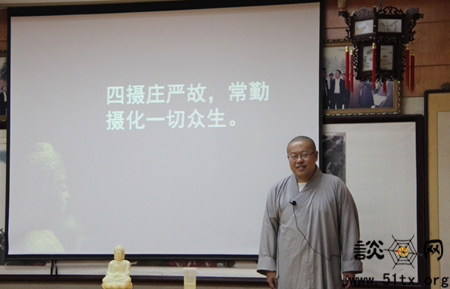 图为纯善法师正在为信众开示“四摄”