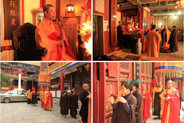 上午十点,水陆法会总监坛愿成法师领引礼法师、斋主来到方丈室礼请隆醒大和尚上堂为斋主说法。随后隆醒大和尚被迎请到大雄宝殿,在拈香礼佛后为斋主说法。数百位信众聆听法音,同沾法益。