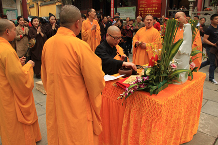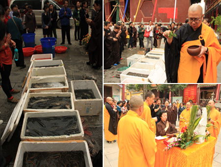2015年4月24日(农历三月初六),宝通禅寺水陆法会已启建五天,今天举行放生仪式。仪式开始前上千水族已被置放于客堂前。