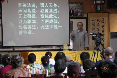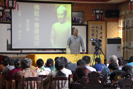 图为纯善法师为信众开示《佛说十善业道经》第四讲