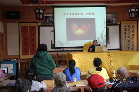 之后法晗法师对“功德”进行了详解。在此之前,法晗法师让在场信众谈了自己对于“功德”的看法和认识。在听完几位信众的发言后,法晗法师引用了《丁福保佛学大辞典》和《六祖坛经》对“功德”进行了解析,并开示到:行诸多善事而有功德的前提——是行善之人要发菩提心,通俗地说就是行此善事的动机要正。同时进一步开示了何谓“发心正”。