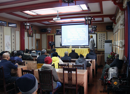 2016年12月11日(农历十一月十三)下午2:20,纯善法师在近百位信众的礼请下来到武汉宝通禅寺《谈心》杂志学佛讲堂。登上讲台后,信众起身合掌向纯善法师致敬。纯善法师本周日为信众开示了《药师琉璃光如来本愿功德经》第五讲。