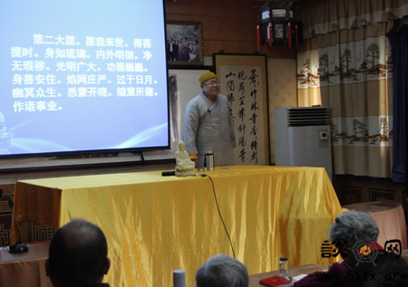 下午2:20,纯善法师在信众礼请下登上讲台。承接前几期讲座,本期讲座纯善法师为信众开示药师佛因地修行所发十二大愿中的第二大愿和第三大愿。纯善法师在开示中首先为信众逐句解析经文。随后,对经文中的重点展开阐释。