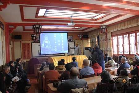 2017年2月12日(农历正月十六)下午2:20,纯善法师在近百位信善信居士的礼请下来到武汉宝通禅寺《谈心》杂志学佛讲堂。登上讲台后,善信居士起身合掌向纯善法师致敬。纯善法师本周日为信众开示了《药师琉璃光如来本愿功德经》第十一讲。